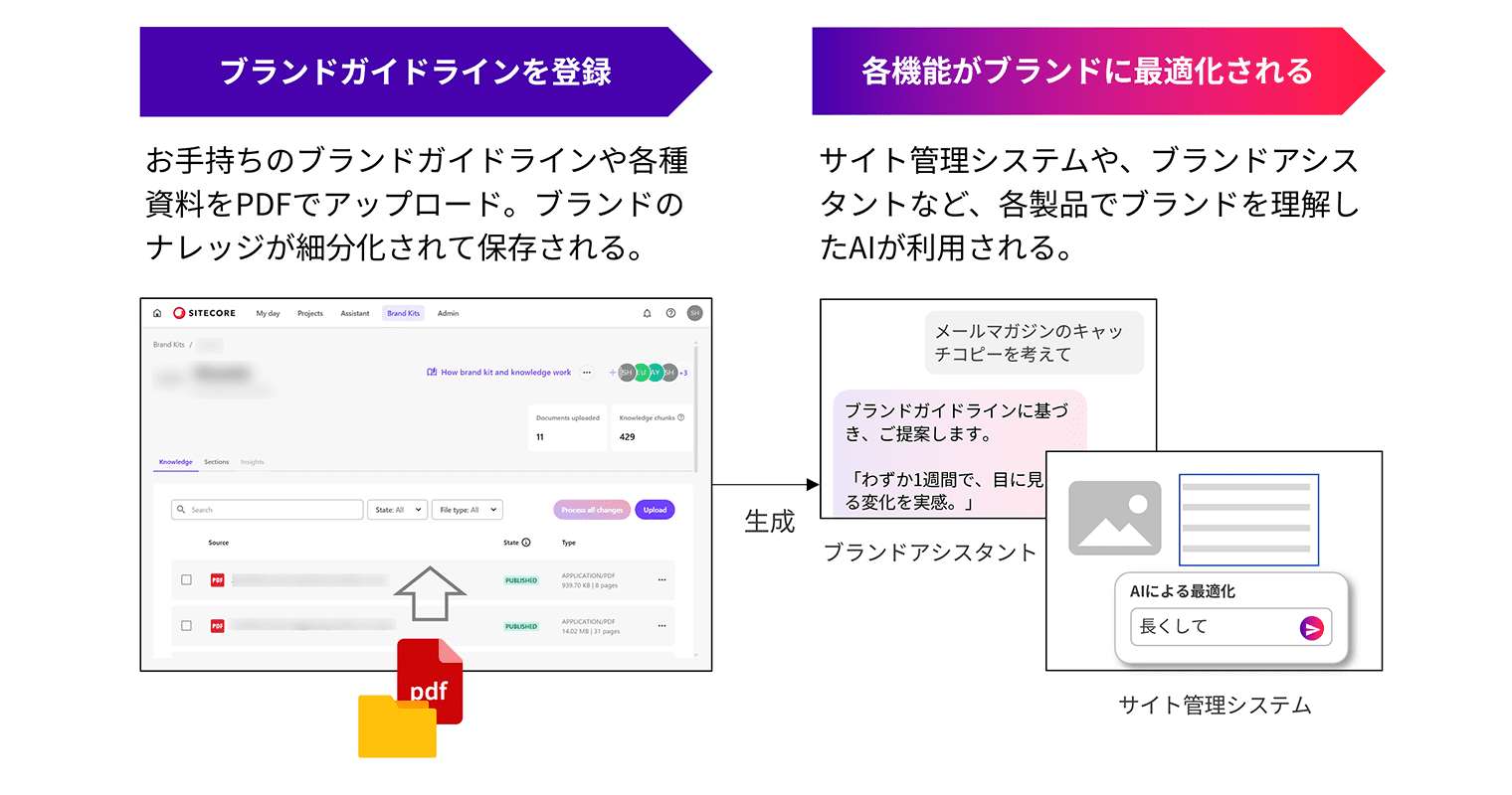 「Sitecore Stream」は「ブランド認識型AI(Brand Aware AI)」により、企業が持つブランドガイドラインや過去のコンテンツ資産を取り込み、ブランド独自の文脈を深く理解することで、生成するコンテンツや、マーケティング施策がブランドの個性に適合するように支援します。
